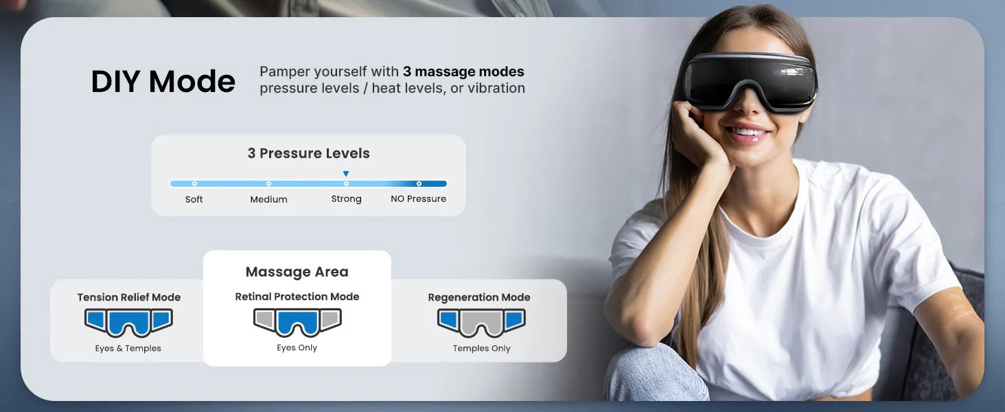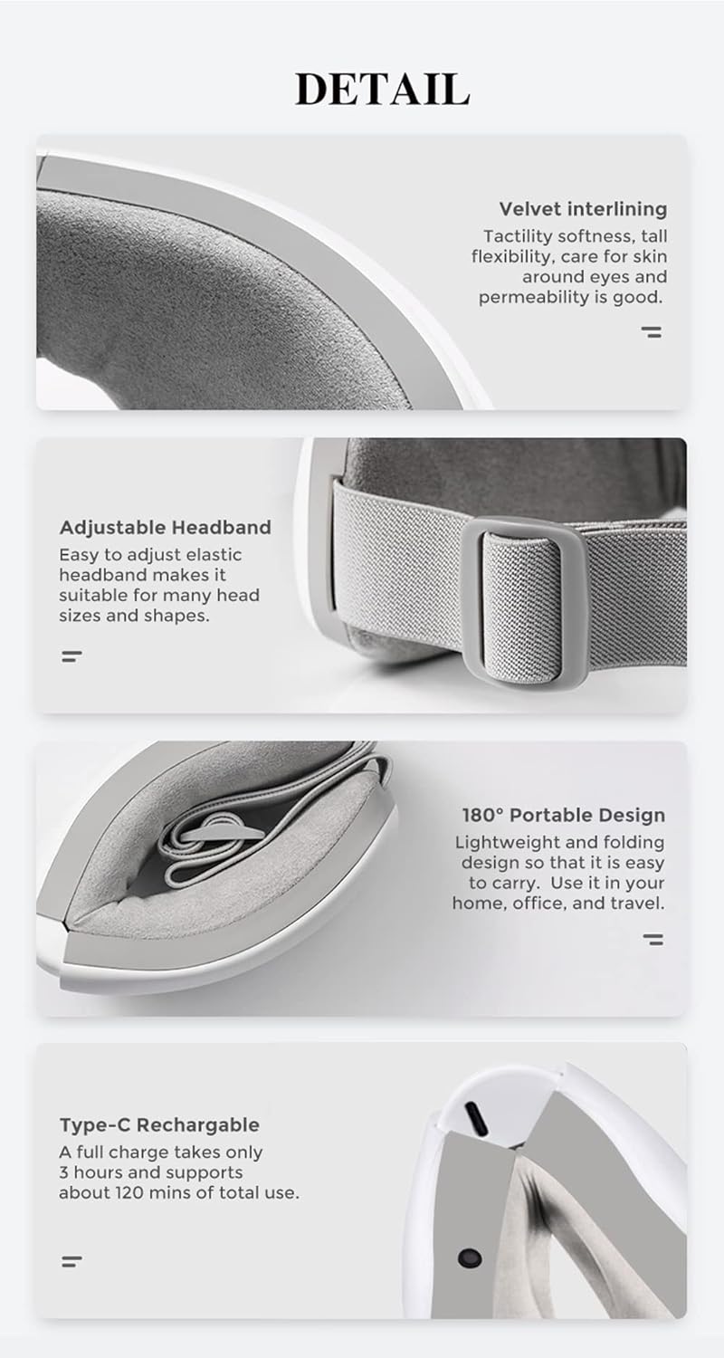 My daughter bought me this for Christmas because I suffer for migraines. I love it so much that I am actually purchasing a second one for when I travel.. this eye mask massager has given me so much relief, and has stopped an oncoming migraine it’s tracks several times, and if you suffer from migraines, as I do, then you will understand the importance and significance of this. I recommend this eye massager to anyone who feels fatigue, stress and pain in and or near your eyes and head, and, of course migraines.